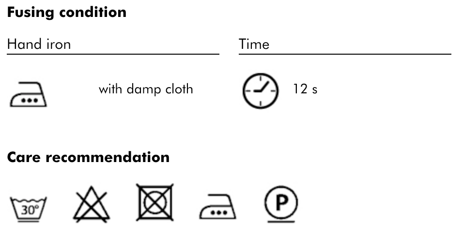 2. Place the interlining on the reverse side of the fabric with the coated side facing down, cover with a damp cloth and iron section by section for around 12 seconds. Do not push the iron.